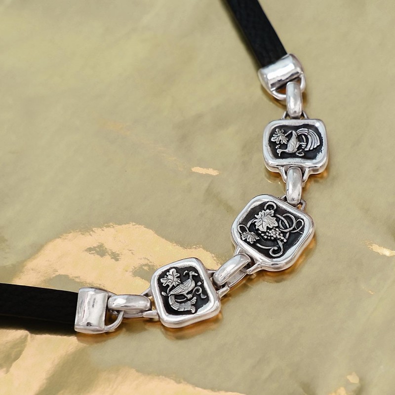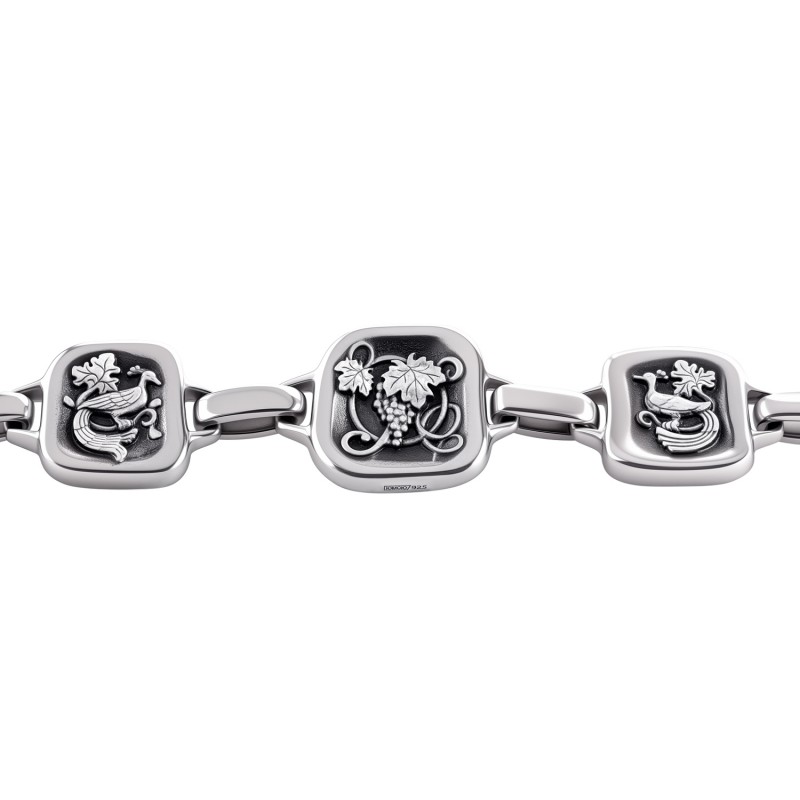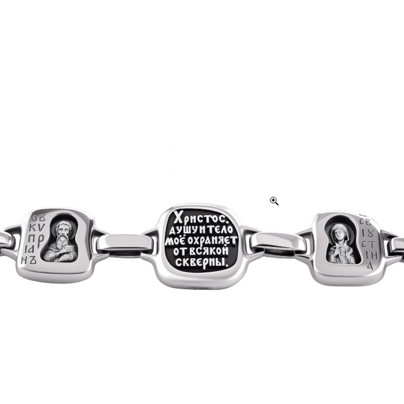 На серебряной подвеске браслета на центральном элементе помещена молитва "Христос душу и тело охраняет от всякой скверны", а на боковых элементах образы священномученика Киприана и мученицы Иустины. С внутренней стороны браслет украшен христианскими символами - райскими птичками и виноградной гроздью.
