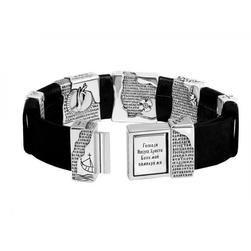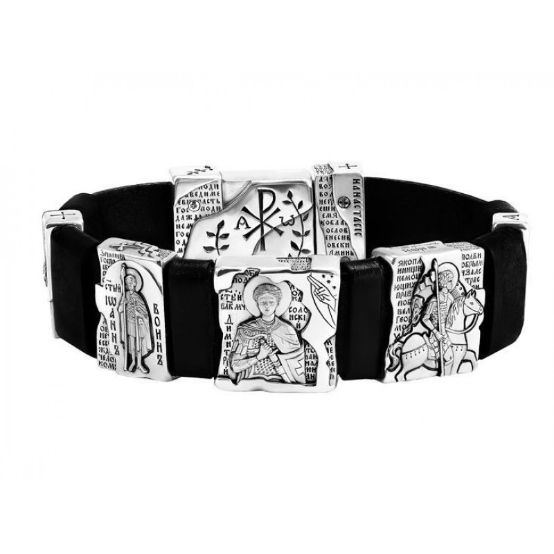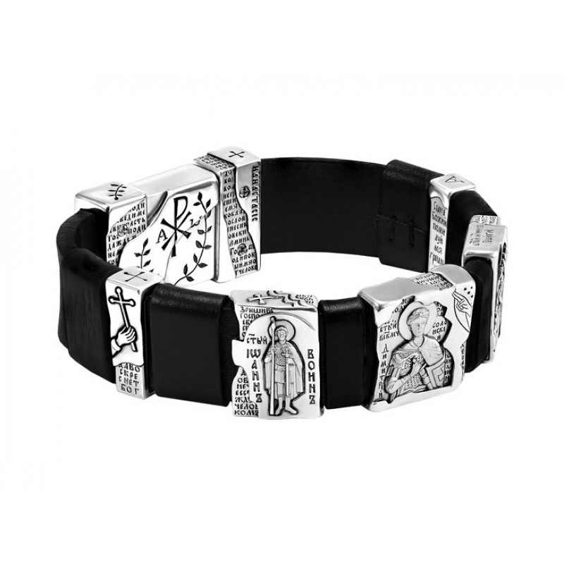 БРАСЛЕТ "СВЯТЫЕ ВОИНЫ" ИЗ КОЖИ И СЕРЕБРА
