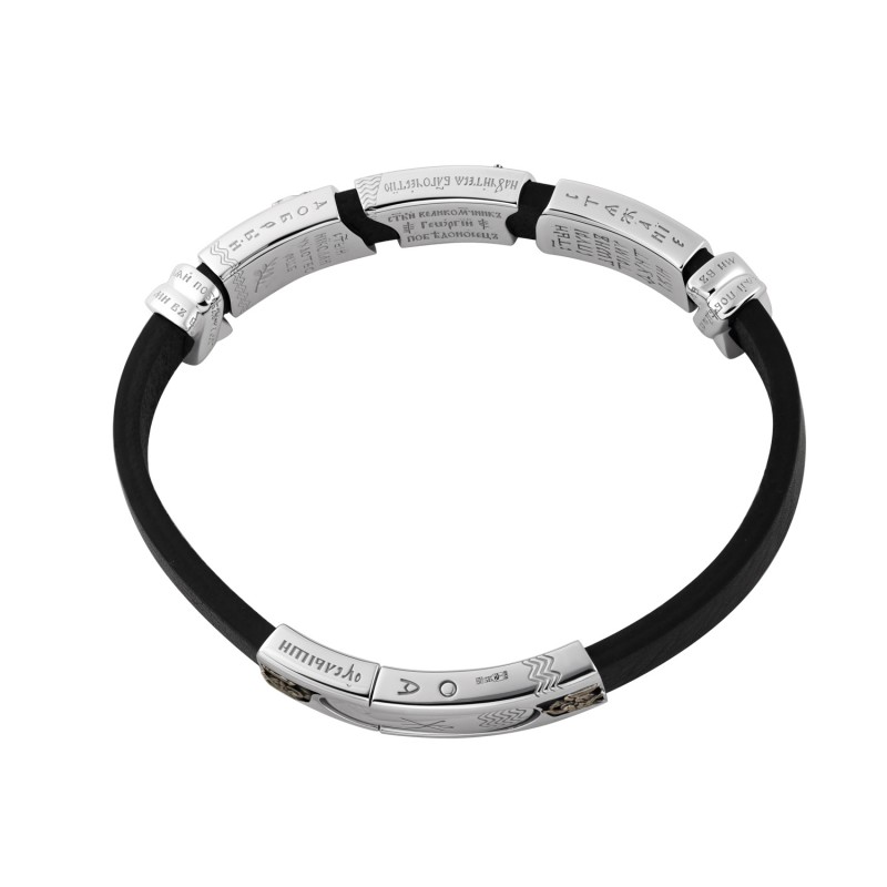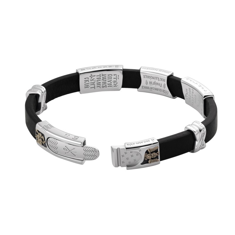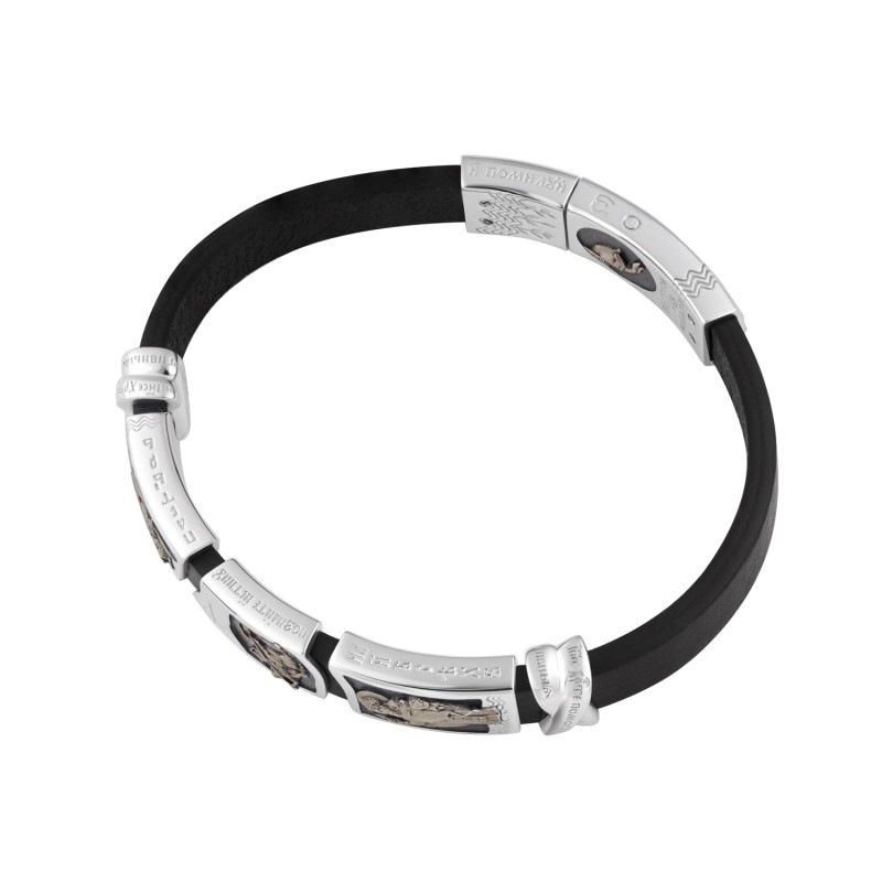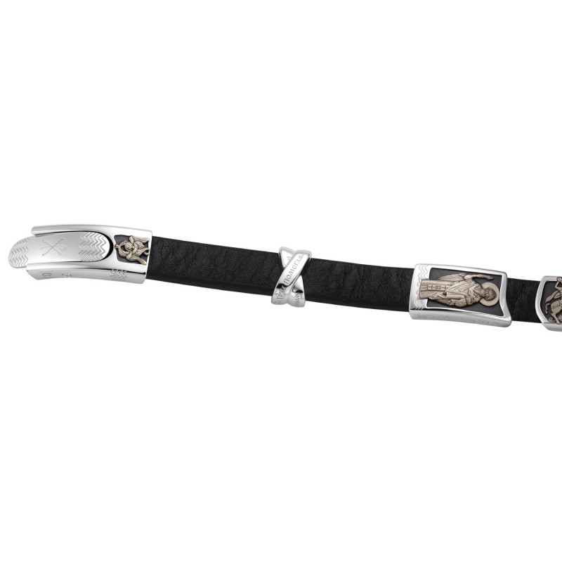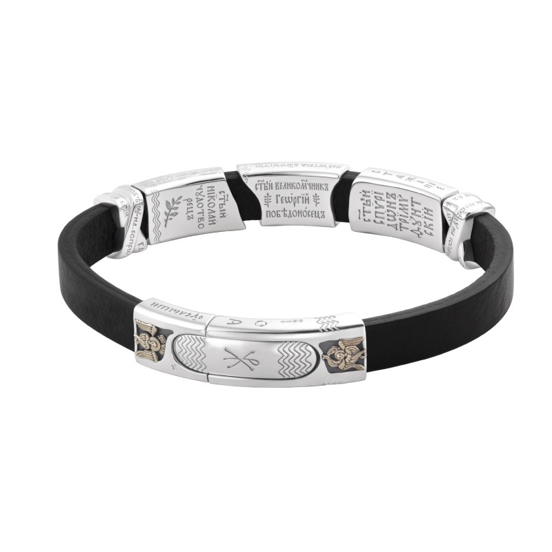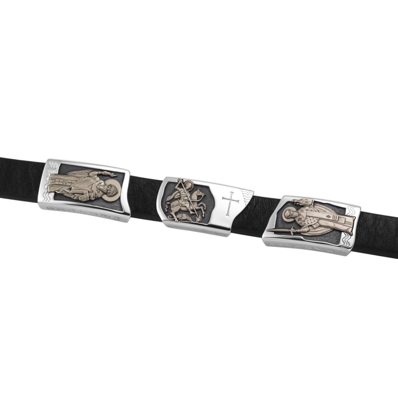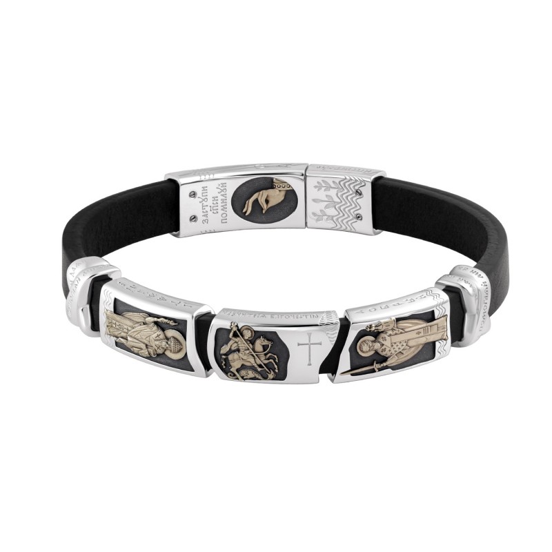 ЗОЛОТОЙ БРАСЛЕТ "ГЕОРГИЙ ПОБЕДОНОСЕЦ, НИКОЛАЙ ЧУДОТВОРЕЦ И СПИРИДОН ТРИМИФУНТСКИЙ" изготовлен из кожи и белого золота 585 пробы с родированием и патинированием.