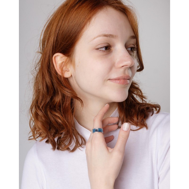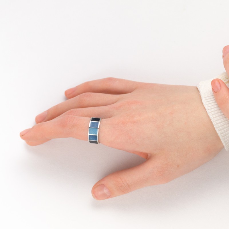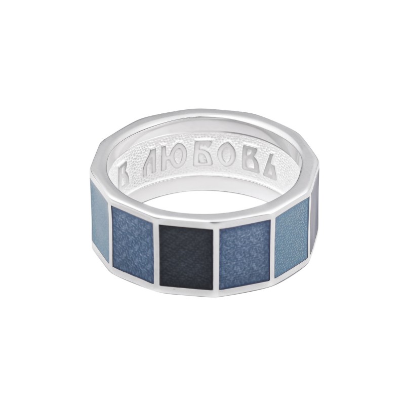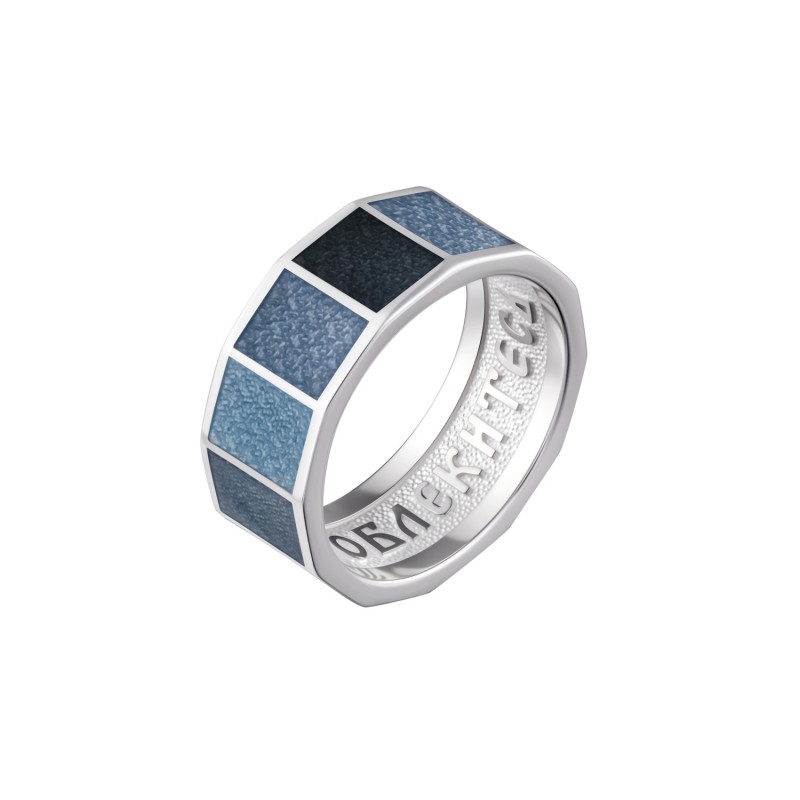 Очень нежное кольцо из серебра 925 пробы, выполненное по внешней стороне в форме многогранника, грани которого покрыты горячей эмалью разных оттенков небесно-синего цвета.