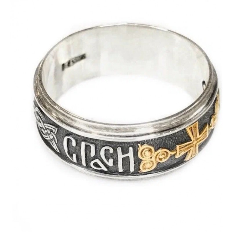 Широкое серебряное кольцо Спаси и Сохрани с золотым орнаментом, техника исполнения- ручная работа.