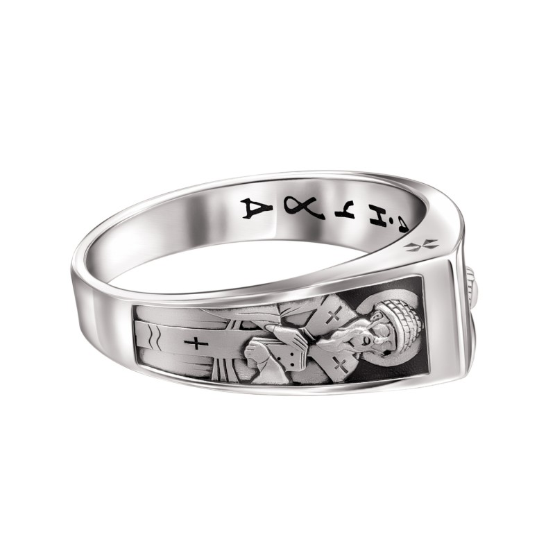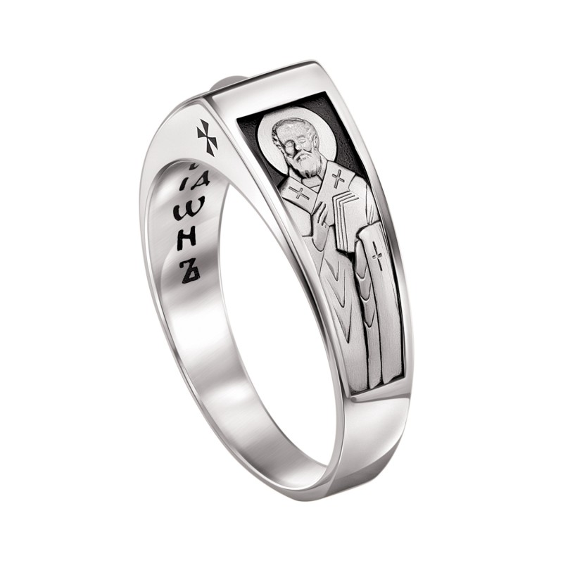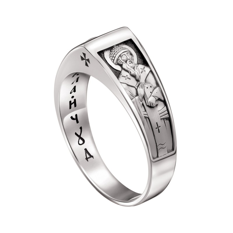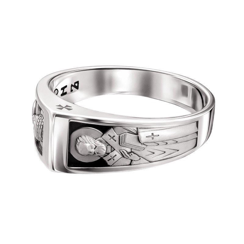 СЕРЕБРЯНОЕ КОЛЬЦО "СПИРИДОН ТРИМИФУНТСКИЙ И НИКОЛАЙ ЧУДОТВОРЕЦ" изготовлено из серебра 925 пробы с применением техники патинирования, что придает особую выразительность деталям изображения и защищает серебро от естественного потемнения и потускнения.