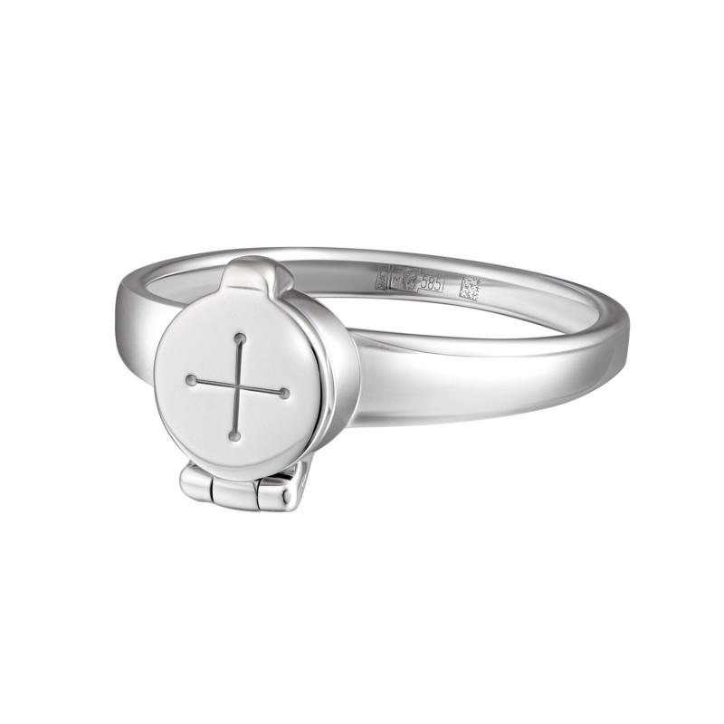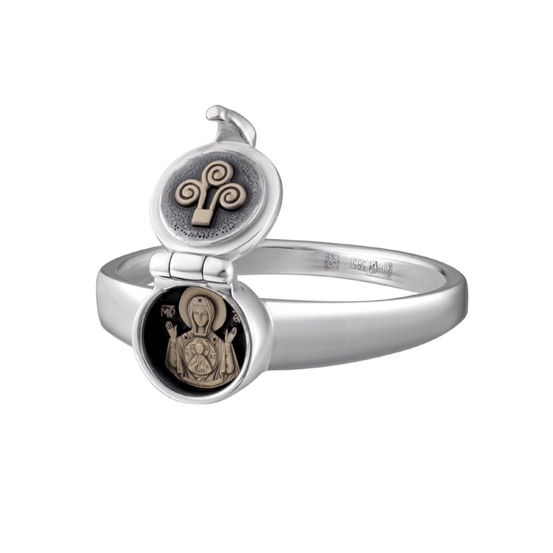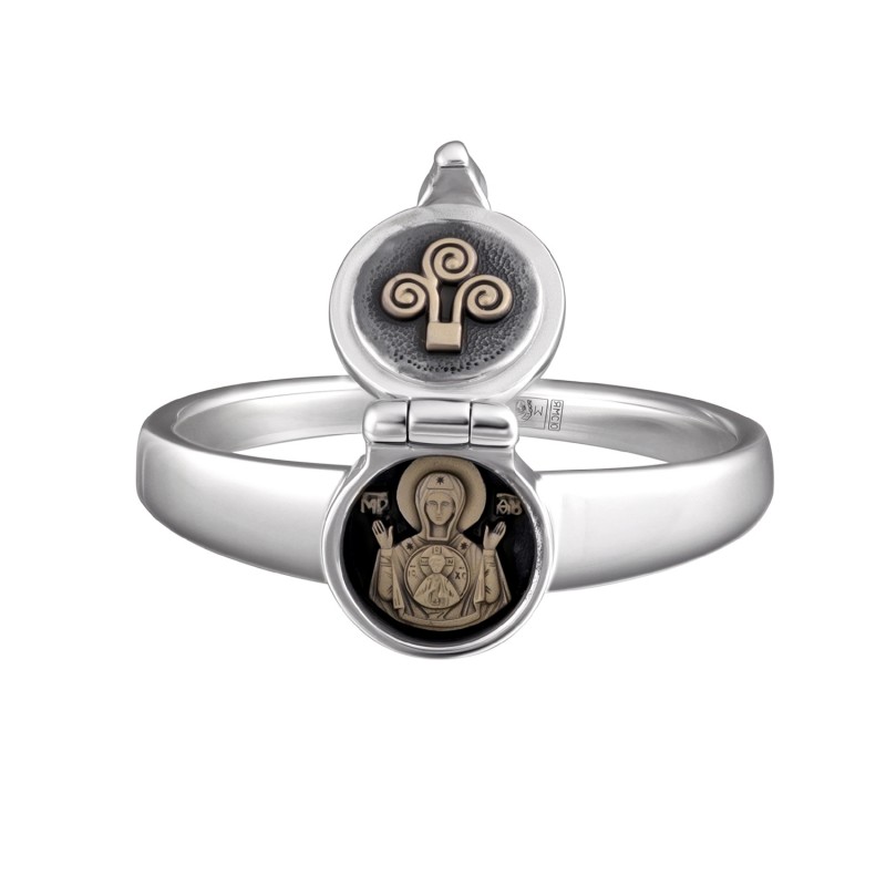 Это оригинальное кольцо является элегантным современным украшением снаружи, а внутри него под украшенной крестом крышкой складня защищённая от внешних воздействий помещена икона Пресвятой Богородицы "Знамение".