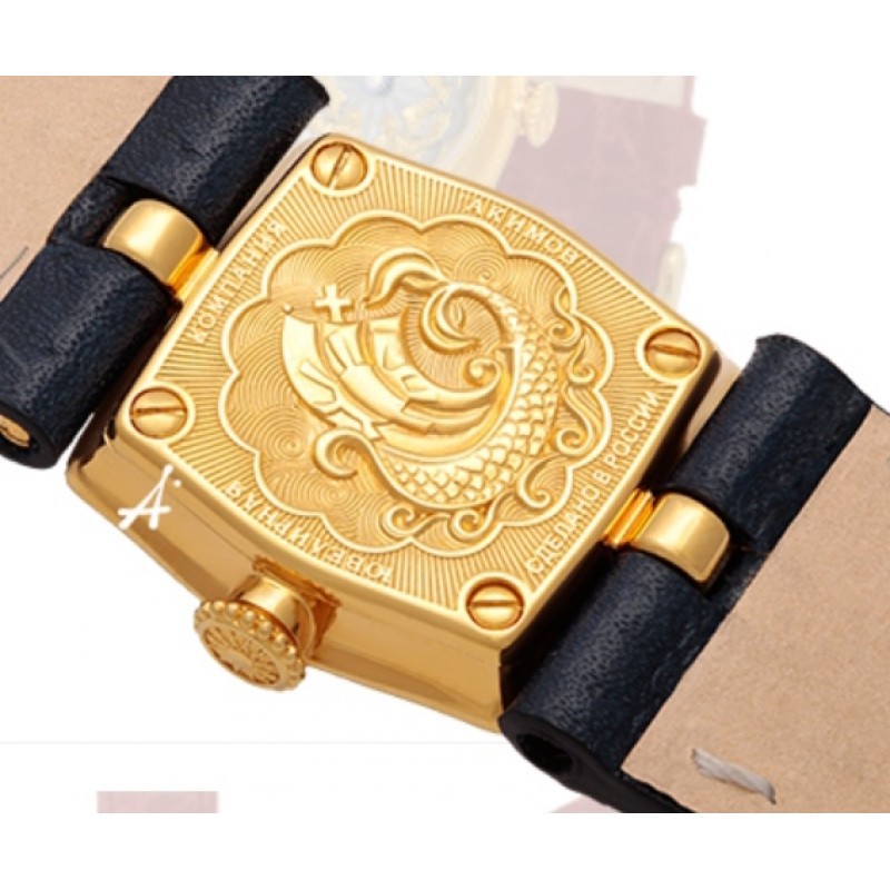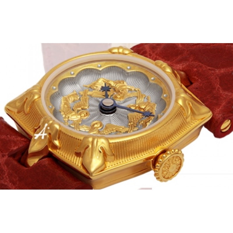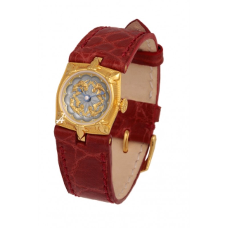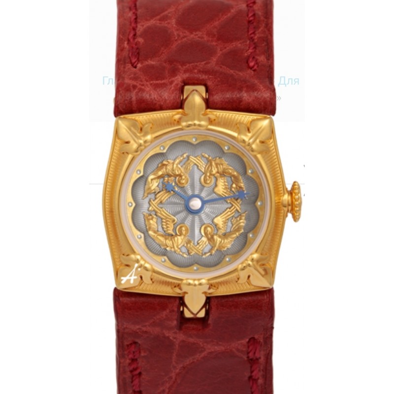 Дополняет художественный образ часов цветной кожаный ремешок, он снабжен золотой пряжкой, орнаментальное украшение которой составляет единую композицию с корпусом. Ремешки выпускаются разных цветов и легко заменяются.